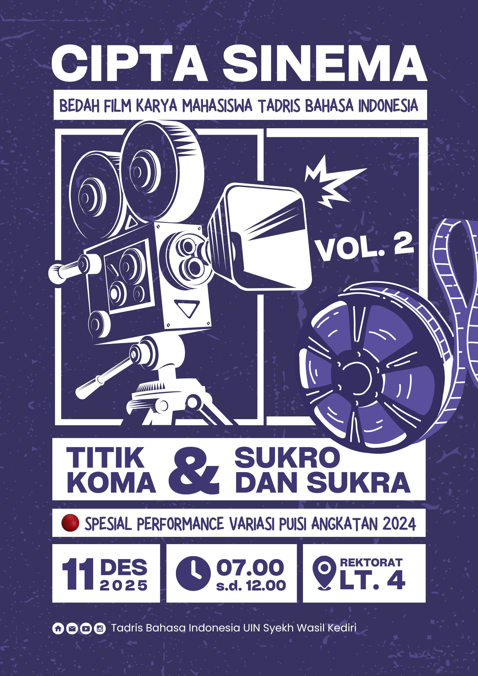Read More Cipta Sinema Vol. 2: Bedah Film Karya Mahasiswa Tadris Bahasa Indonesia Program Studi Tadris Bahasa Indonesia UIN Syekh Wasil Kediri kembali menghadirkan kegiatan Cipta Sinema Vol. 2, sebuah ruang apresiasi dan diskusi film pendek karya mahasiswa Tadris Bahasa Indonesia.